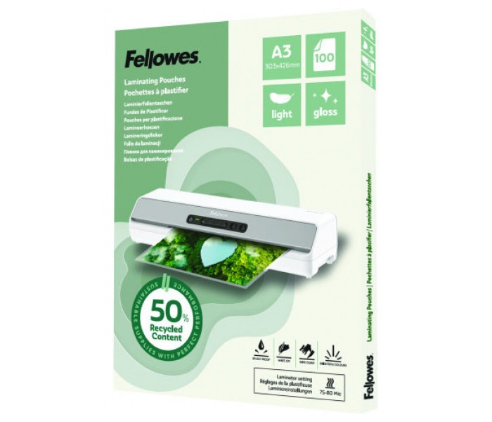 PACK 100 FUNDAS DE PLASTIFICAR RECICLADAS BRILLO A3 FELLOWES 100142988 (Espera 4 dias)