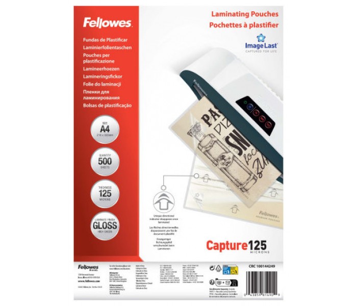 PACK 500 FUNDAS PLASTIFICAR 125 MICRAS BRILLO A4 (216X303 MM) FELLOWES 100144249 (Espera 4 dias)