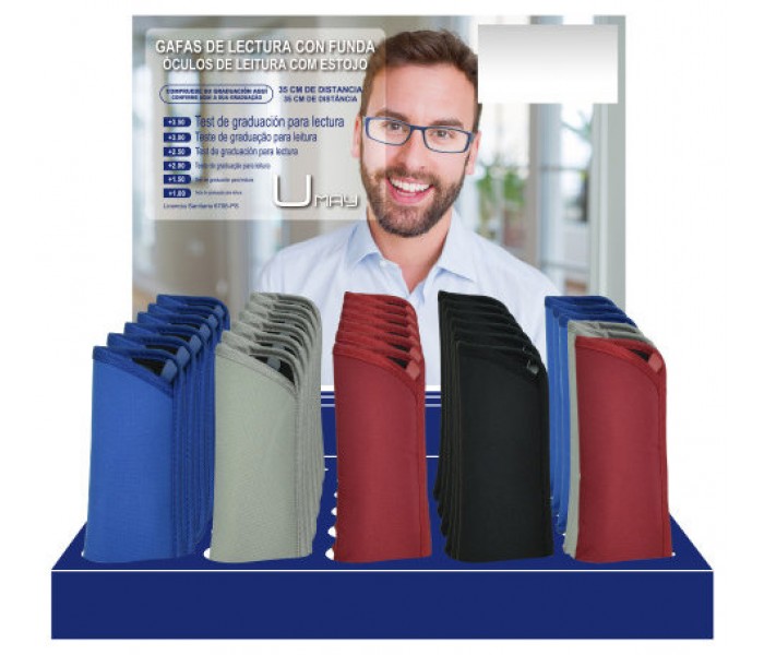EXPOSITOR 30 GAFAS LECTURA CABALLERO PATILLAS FLEXIBLES 4 MODELOS COLORES Y GRADUACIONES SURTIDOS UMAY 329652