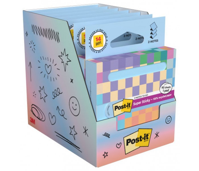 Las Z-Notas Post-it® Super Sticky Recicladas, tienen doble poder de adhesión que una nota Post-it® tradicional y, al estar fabricadas con papel reciclado 100%, le ayudan a reducir el impacto sobre el medio ambiente. Con las Z-Notas Post-it® Recicladas al tirar de una nota, la siguiente queda lista para su uso. Tan fácil como tirar y escribir.