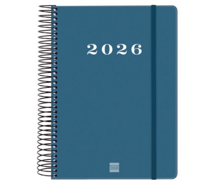 Agenda de espiral de estilo moderno y universal con tapa dura de cartón forrado con peliculado mate antirrayaduras. Ideal para uso personal y/o profesional. Con goma elástica. Esquinas microperforadas para localizar rápidamente el día/semana en curso. Contiene información de interés en la anualidad y otros contenidos extra. Formato similar a DIN A5 con las ventajas de una agenda portable y una de sobremesa. Duración: Enero 2026 - Diciembre 2026 (12 meses). Interior: 1 Día Página. Amplio espacio de escritura para cada día. Con horas. Sábados y domingos en página completa. Con información de los festivos de España. La anualidad de la agenda incluye la información relativa a: onomástica, festivos nacionales, cambios de estación e inicios de los años nuevos chino, musulmán, ortodoxo y hebreo. La agenda dispone también de otros contenidos extra: datos personales, horarios, calendarios, planificación anual del año y del año siguiente, festivos internacionales, cómo buscar en Google, usos del teclado, mapa de Europa y de los husos horarios, hojas para notas y hojas para teléfonos, direcciones y e-mails. Idioma del artículo: español. Formato: E10 - 155x212 mm. Tapas de cartón forrado con peliculado mate antirrayaduras, espiral simple metálica y papel. 70 g/m². Papel FSC®.