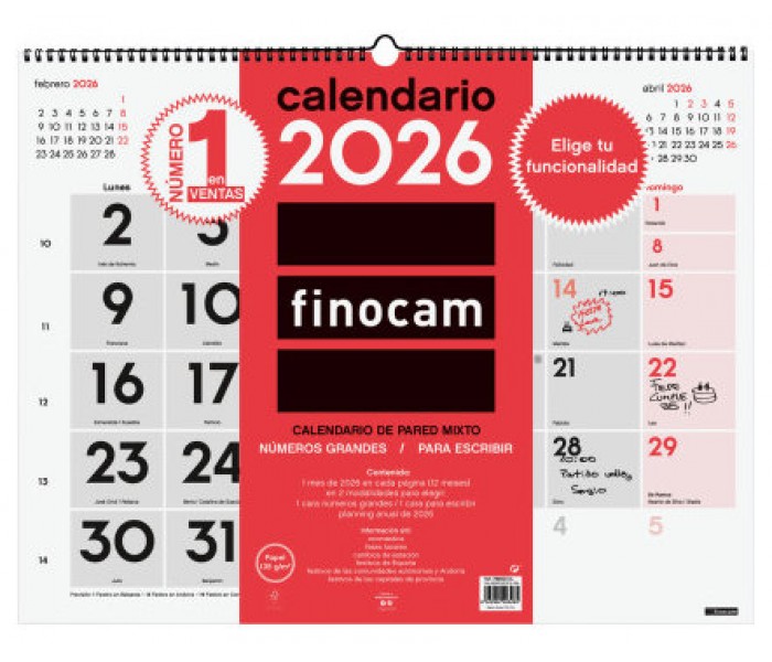 Calendario anual de pared de gran formato, encuadernado con espiral doble y con colgador. Papel de alto gramaje. Con doble funcionalidad a escoger: en una cara, el mes con espacio diario para anotaciones, y en la otra cara, el mes con números grandes. ¡Elige la funcionalidad que va contigo! Con mes anterior y posterior en cada página. Calendario con información útil y de interés. Adecuado para espacios amplios, ideal para salas de reuniones. Duración: Enero 2026 - Diciembre 2026 (12 meses). Interior: Mes Vista. Escoge la funcionalidad: números grandes o para escribir. Con información de los festivos de España. La anualidad del calendario incluye la información relativa a: onomástica, festivos nacionales, festivos de las CC. AA., días señalados, fases lunares y cambios de estación. El calendario dispone también de otros contenidos extra: calendario anual del año y del año siguiente, planning anual, listado de festivos de las CC. AA. y de las capitales de provincia e inicios de los años nuevos chino, musulmán, ortodoxo y hebreo. Idioma del artículo: español. Formato: XL - 540x420 mm. Papel y espiral doble metálica. 135 g/m². Papel FSC®.
