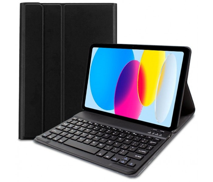 Funda con teclado Bluetooth para iPad (2022 / 2024) (10 Gen.) de 10.9", con cubierta plegable, cierre magnético y suave interior para proteger la pantalla. La Funda está realizada con polipiel suave de color negro muy agradable al tacto, con un excelente acabado interior que le ayudará a proteger su tablet de rayaduras y otros peligros como caídas, salpicaduras, arena, etc...