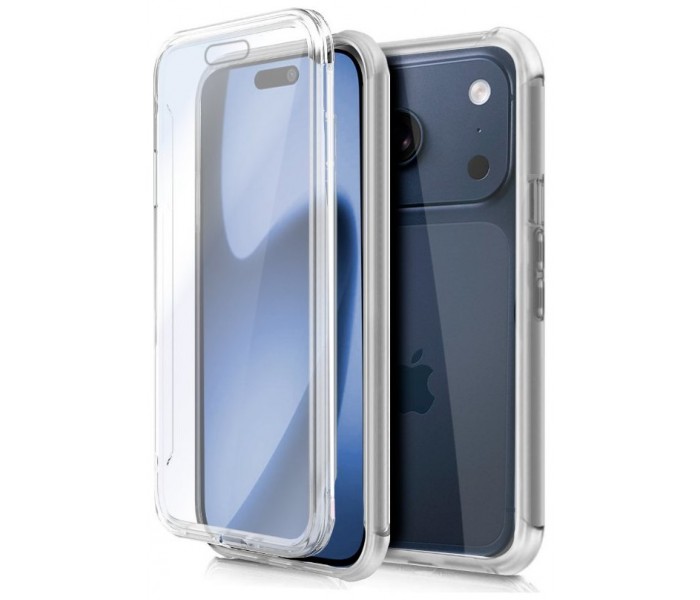 Funda resistente para móvil, de tipo transparente, silicona semirígida 360º, cubre parte frontal y trasera del smartphone.