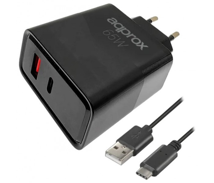 . Carga rápida PD 3.0 y QC 3.0.. Entrada: 100 - 240 VAC 50 / 60Hz 0,8 A.. Salida USB-C: 5 VDC / 3,0 A; 9 VDC / 3,0 A; 12 VDC / 3,0 A; 15 VDC / 3,0 A; 20 VDC / 3,25 A.. Salida USB-A: 5 VDC / 3,0 A; 9 VDC / 2,0 A; 12 VDC / 1,5 A.. Potencia USB-C: 65 W máx.. Potencia USB-A: 18 W máx.. Cable USB-C a USB-A de 1 m incluido.. Material: Plástico Ignífugo.. Color: Negro.. Peso: 108 g.. Dimensiones: 54 x 28 x 54 mm..APPROX CARGADOR 65W QC 1 X USB A+ 1 X USB C+CABLE