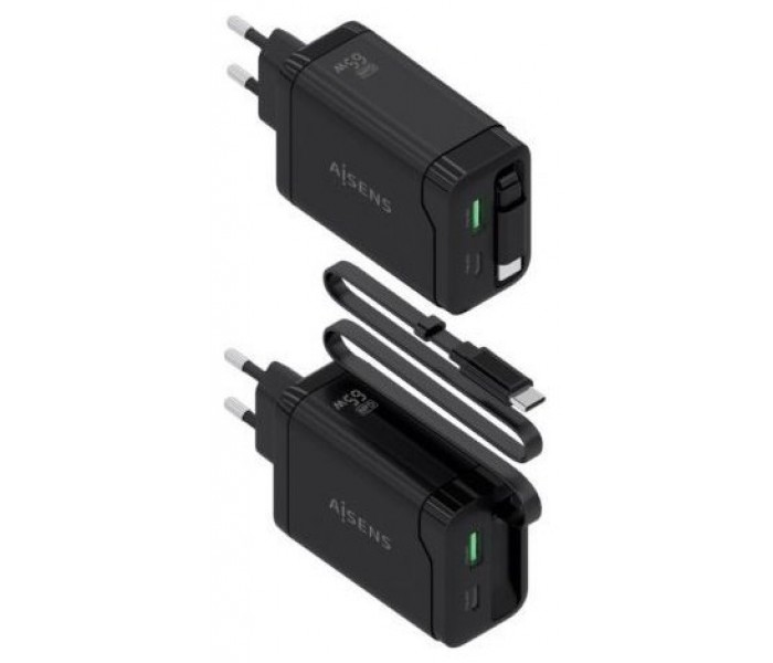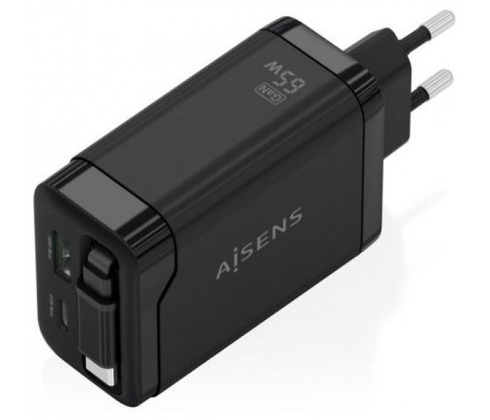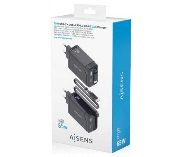 Cargador de Pared GaN Aisens ASCH-65W3P042-BK/ 2xUSB Tipo-C/ 1xUSB/ 65WAISENS - CARGADOR GaN 65W, 2xUSB-C PD3.0 QC4.0, 1xUSB-A QC3.0, NEGROCargador GaN USB-C 65W para cargar portátiles, móviles, cámaras y tablets etc. Diseño muy elegante, moderno y práctico.Este cargador cuenta con la tecnología GaN que ofrece una serie de ventajas, incluyendo una ..