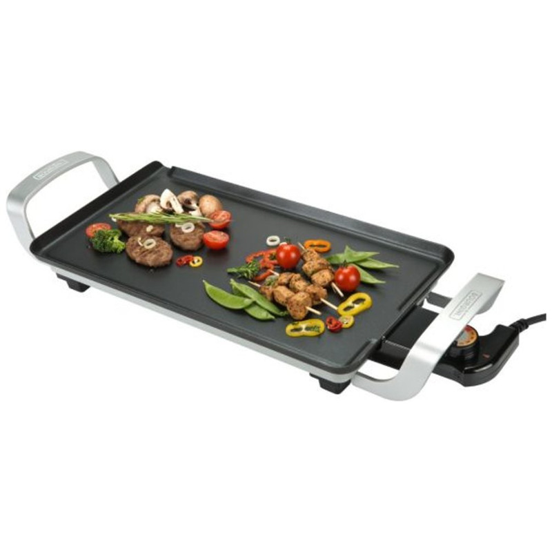 Plancha y grill con la máxima antiadherenciaPlancha de asar potente y rápidaPlancha de asar eléctrica de 2000 W de potencia para cocinar todo tipo de alimentos de forma rápida y precisa gracias a su resistencia integrada, que garantiza una homogénea distribución del calor en toda la superficie de cocción.Máxima antiadherencia, dureza y resistenciaP..