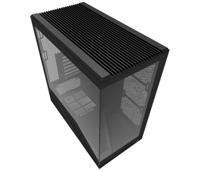 El lateral de la caja, con su inclinación estratégica, no solo le da un look agresivo, sino que también mejora la circulación del aire. Este diseño innovador facilita que la fuente de alimentación (PSU) reciba aire fresco de manera eficiente, optimizando el rendimiento general del sistema.