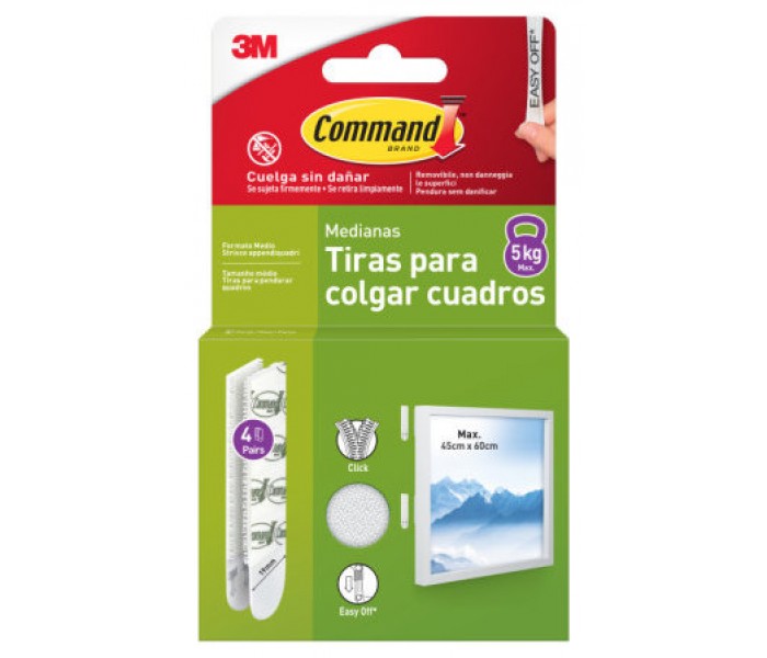 Tiras medianas para colgar cuadros Command 3M. Formato: pack 4 unidades. Medidas: alt. 70 x an. 19 mm Cuelga sin dañar, fiable y fácil de retirar. Uso: interior. Perfecto para paredes sólidas, huecas y pintadas. Superficies para colgar sin dañar: maderas pintada o barnizada, hormigón o bloques de hormigón pintado, azulejos, metal, vidrio, laminados y mayoría de plásticos y acrílicos sólidos lisos. Rango de temperatura: +10 ºC y +40 ºC Carga máx: 2,7 Kg (2 tiras) hasta 5,4 Kg Material: PVC. Peso: 80 g Color: blanco.