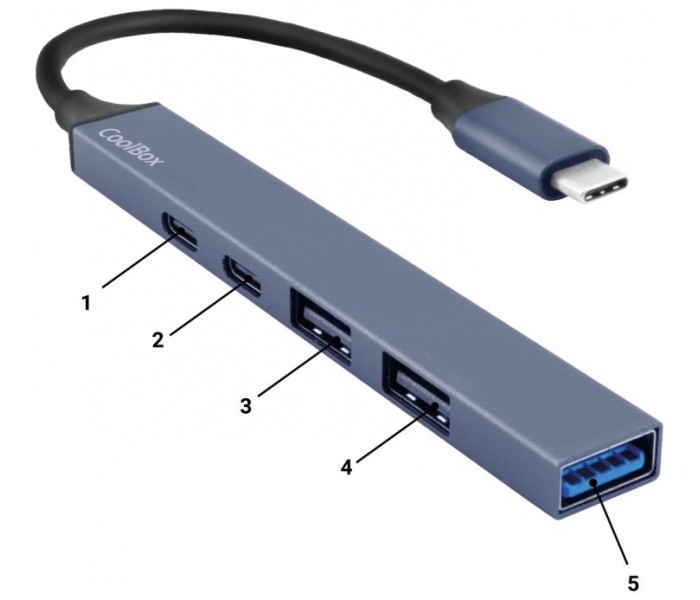 Conexión. USB Tipo C. Plug&Play. No requiere drivers.. Material: Aluminio, cable PVC. Dimensiones: 103,9 x 14,7 x 7,4 mm. Peso: 21,4 gramos. PUERTOS:. Puerto 1: USB-C (PD) Power delivery 2.0. Carga maxima de 100W. Puerto 2: USB-C (DATA USB2.0) Velocidad de transferencia max: 480Mbps. Puerto 3 y 4: USB-A (USB 2.0) Velocidad de transferencia max: 480Mbps. Puerto 5: USB-A (USB 3.2 Gen1) Velocidad de transferencia max: 5Gbps
