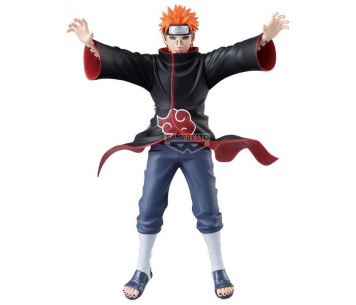 Figura de Pain de la serie Naruto Shippuden perteneciente a la línea Vibration Stars. Mide 17 cm de alto y presenta al personaje en una de sus poses más emblemáticas, con los brazos abiertos y una expresión desafiante. Los detalles del rostro, el peinado característico y la túnica de Akatsuki están cuidadosamente recreados para reflejar la intensidad y autoridad del personaje.