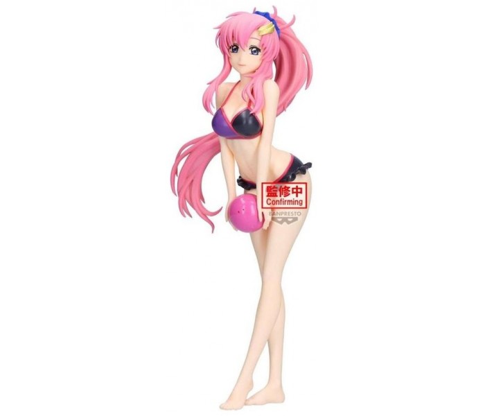 La figura muestra a Lacus con un **atuendo de baño negro y morado**, en una pose delicada que resalta su carisma y serenidad. Cada detalle, desde su **larga melena rosa** hasta la **pelota pequeña que sostiene con suavidad**, ha sido cuidadosamente esculpido para transmitir su presencia calmada y distintiva.