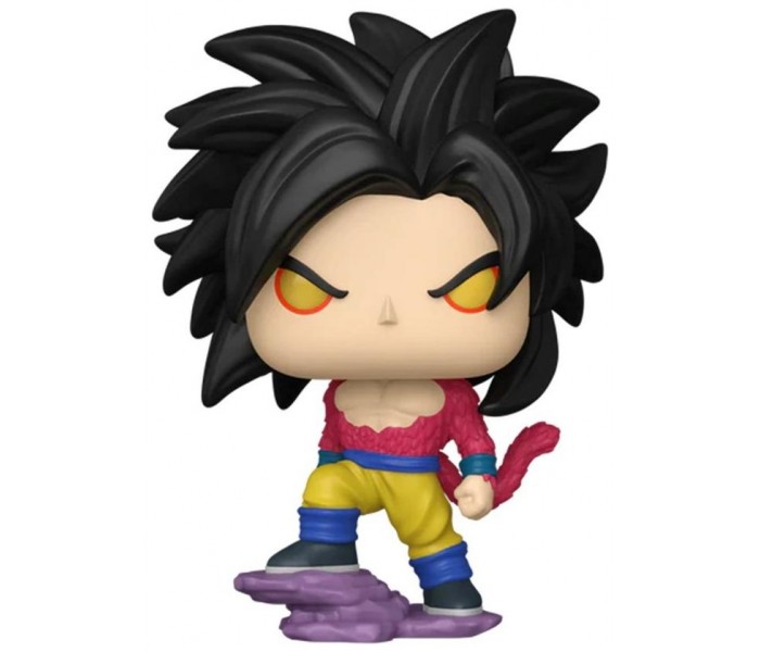 Esta figura pertenece a la línea **POP! Vinyl** de Funko, conocida por su estética cabezona y detalles estilizados. Goku aparece con su característico pelaje rojo, cabello oscuro y mirada desafiante que lo identifican en su nivel **Super Saiyan 4**, tal como se muestra en la serie.