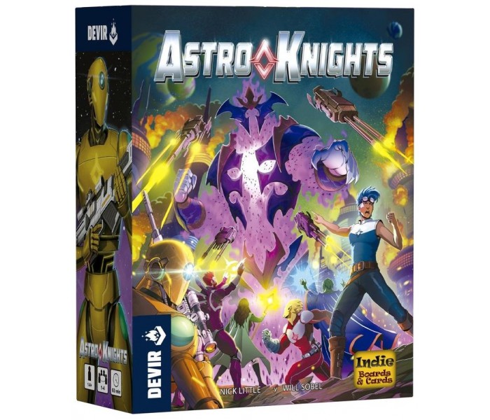 Corren tiempos oscuros en el universo. Robots insurrectos, invasores extradimensionales y belicosas monstruosidades amenazan los confines de nuestra galaxia. ¡Nuestra única esperanza de supervivencia es un nuevo y poderoso invento que puede convertir a gente corriente en un súper equipo galáctico extraordinario! Es hora de que nuestros héroes asuman el desafío y se conviertan en? ¡Los Astro Knights! Astro Knights es un juego de construcción de mazos cooperativo donde cada jugador viste el manto de un Astro Knight: los poderosos defensores del universo. A diferencia de la mayoría de juegos de construcción de mazos, en Astro Knights los jugadores nunca barajan sus mazos, lo que significa que la disposición de tus combinaciones tácticas depende de ti. Alimenta tu Núcleo Estelar con toda suerte de combustibles, desde células solares a ondas magnéticas, y usa esa energía para añadir poderosas tecnologías y armas a tu arsenal. Incluso puedes recargar tu propio Núcleo Estelar para utilizar la habilidad especial exclusiva de tu personaje, contribuyendo a girar las tornas contra uno de los cuatro Jefes destructores de mundos. Diseñado por Nick Little y Will Sobel, Astro Knights se puede disfrutar en solitario o en grupos de hasta 4 personas, a partir de 14 años, en sesiones de unos 45 minutos de duración. Vuestro objetivo consiste en derrotar al Jefe antes de que destruya vuestro equipo o el planeta natal que defendéis. Cada ronda, los jugadores y el Jefe juegan turnos siguiendo un orden aleatorio. Durante el turno de un jugador, pueden adquirir combustible, tecnología y armamento del suministro, equiparse y atacar con aquellas armas en función de la cantidad de espacios que tengan, conseguir nuevos espacios, recargar, y usar su habilidad especial. Los cuatro jefes del juego cuentan con sus propios mazos y habilidades, y para derrotar a cada uno será necesaria una estrategia diferente. Los jugadores deben trabajar en equipo para anular esta amenaza. La comunicación durante la partida y la planificación para derrotar al Jefe está permitida, ¡y recomendada!