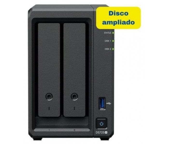 NAS Synology Diskstation DS725+/ 2 Bahías 3.5"- 2.5"/ 8GB DDR4/ 8TB/ Formato TorreDiskStation DS725+ Almacenamiento compacto y capaz para el hogar, pequeñas empresas y edge 2 bahías con expansión Hasta 140 TB de almacenamiento bruto con unidad de expansión Almacenamiento de alta velocidad Puerto integrado de 2.5GbE y más de 276/224 MB/s ..