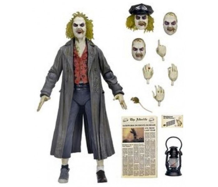 Neca presenta, dentro de la colección Scale Action Figure, la figura de Ultimate Beetlejuice Tour Guide The Bio-Exorcist. Mide 18 cm y está basada en el personaje de la pelÃcula de 1988 ""Beetlejuice"" (""Bitelchús"" en España). Incluye 3x placas faciales extras, 1x sombrero, 4x manos,1x rata, 1x periódico, 1x linterna y 1x folleto de Betelgeuse. Se presenta en una caja con ventana.