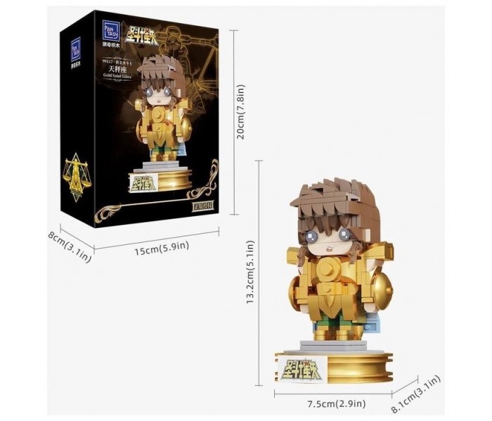 Pantasy presenta dentro de la colección Saint Seiya, este set de construcción mini del Caballero de Oro de Libra. Tiene unas medidas finales de 13,2 x 8,1 x 7,5 cm y está basado en su aspecto en el anime ""Saint Seiya"" (o ""Los caballeros del Zodiaco"" en España). El set está formado por 222 piezas, el tiempo estimado de montaje es de 1 a 2 horas aproximadamente y viene con un manual de instrucciones. Set recomendado para mayores de 6 años.