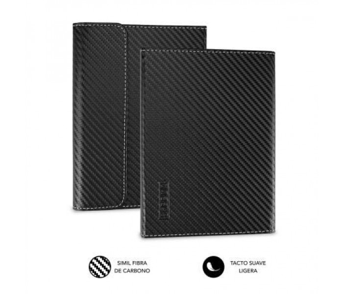 Una funda ligera para proteger y transportar tu lector de libros electrónicos con total seguridad. Material exterior de alta resistencia con acabado en símil Fibra de Carbono e interior de microfibra que lo protege frente arañazos. Su sistema de plegado te permite leer cómodamente, incluso con una sola mano. La sujeción del dispositivo se realiza mediante una sujeción de silicona muy segura y se cierra gracias a una solapa magnética.Exclusivo Sistema de SujeciónTe permite fijar tu dispositivo de 6” sin dañar su pantalla o marco, gracias al exclusivo sistema de silicona muy resistente y adaptable.Cierre MagnéticoDisfruta de su cierre magnético que además de elegancia, ofrece una alta seguridad facilitando su transporte.Símil Fibra de CarbonoMaterial exterior con acabado en símil de Fibra de Carbono, que repele las gotas de agua y ofrece una alta resistencia a los roces.