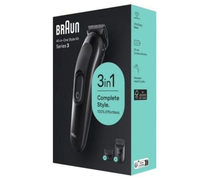 - El kit de estilismo 3 en 1 de Braun para la depilación de barba y vello facial: recortadora de barba, recortadora corporal, cortapelos y recortadora de cabello, todo en uno. Herramientas seleccionadas para el cuidado de la barba y el cabello en casa.