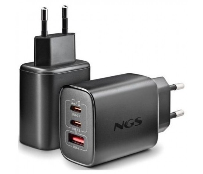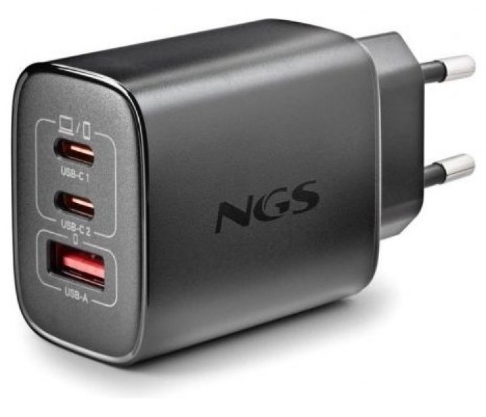 - Cargador GaN de pared con 2 salidas USB-C (PD & PPS) y una salida USB-A QC 3.0 de 65W de potencia máxima para cargar dispositivos de manera rápida y eficiente.
