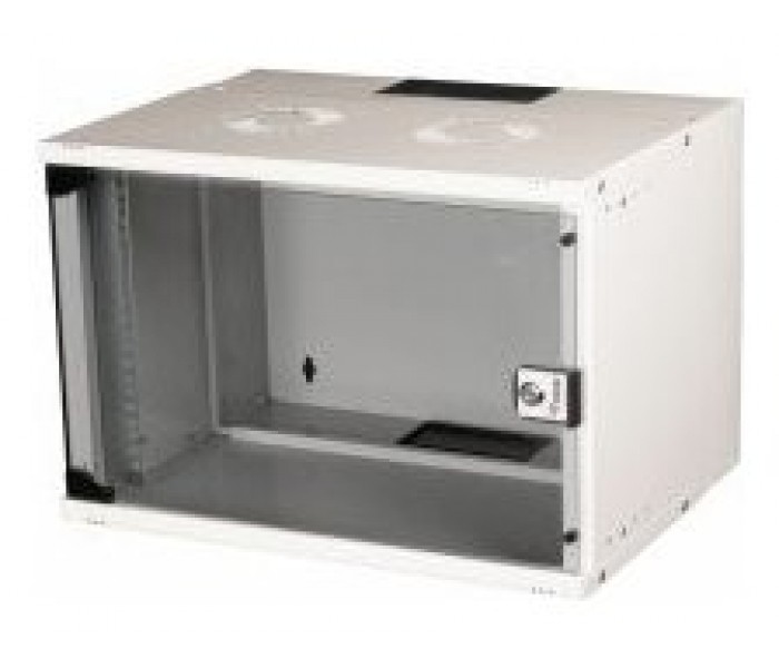 Wall Mount Rack 19" RWB Series 9U WxDxH: 600x500x500 mmnGrey RAL 7035El armario bastidor de pared serie RWB es la solución óptima para instalaciones de pequeño/mediano tamaño que requieren tanto calidad como seguridad.La puerta de cristal templado, el armazón soldado, la resistente y segura estructura y los cierres (también en los paneles laterales..