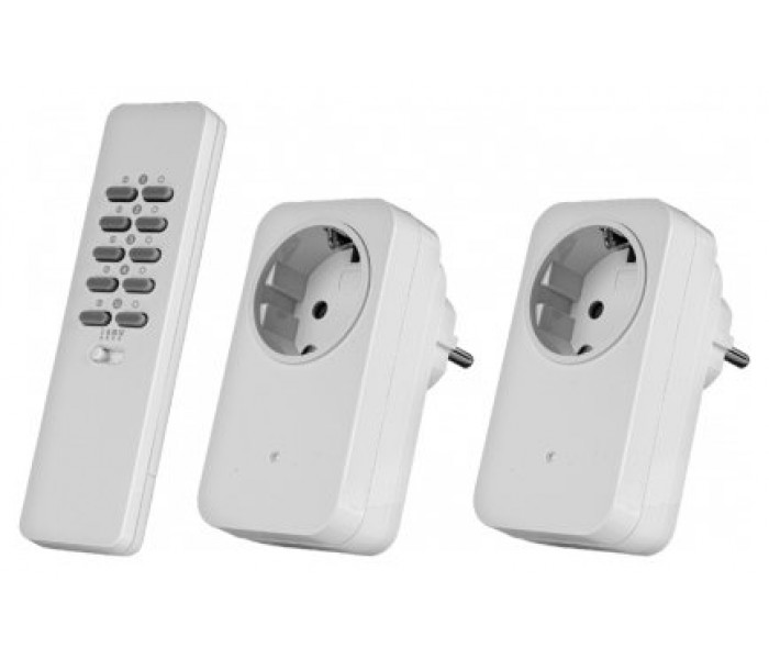 Juego con mando a distancia y dos atenuadores para enchufe interior que permite atenuar de forma inalámbrica todo tipo de luces regulables (máx. 200 vatios).