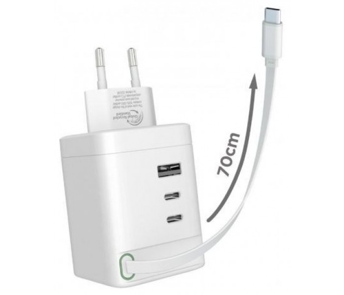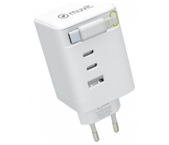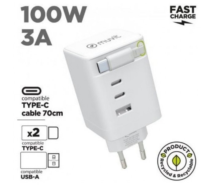 muvit for change cargador de pared Retráctil Tipo C PD 100W,2 USB-C y 1 USB blanco