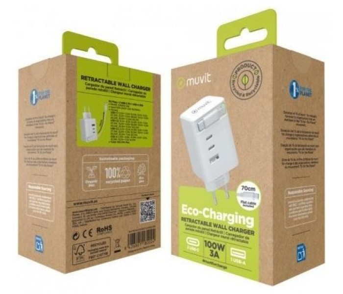 Cargador de pared retráctil de 100W, ideal para viajes, oficinas y hogares. Compacto, potente y respetuoso con el planeta. Diseño retráctil que evita enredos y ahorra espacio. abricado con materiales reciclados y con embalaje 100% reciclable.