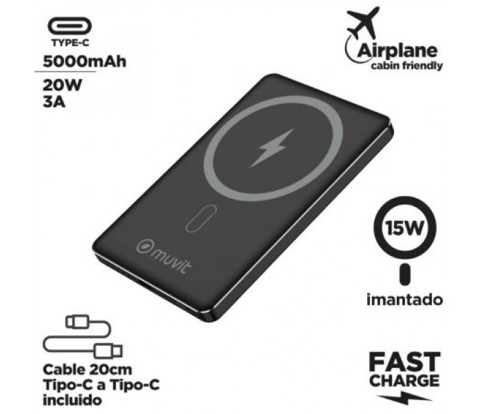 Muvit for change power bank Aluminio 5000mAh Magsafe 15W + conector Tipo C PD20W negro