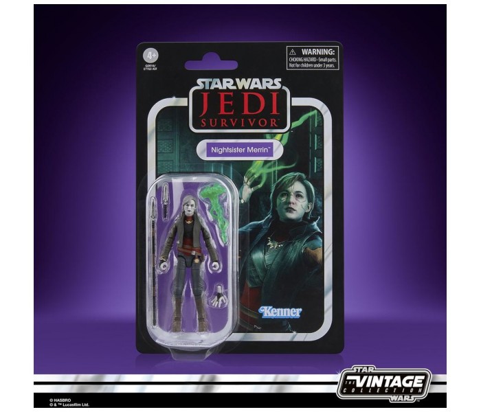 Esta figura de Nightsister Merrin está inspirada en el videojuego *Star Wars Jedi: Survivor* y cuenta con un diseño detallado y un empaque al estilo clásico.
