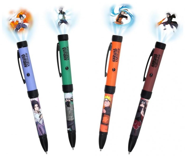 Estos bolígrafos no solo permiten escribir con comodidad, sino que incluyen un **proyector LED integrado** que proyecta una imagen del personaje correspondiente con solo pulsar un botón. Ideal para regalar o sorprender a los fans del universo ninja.