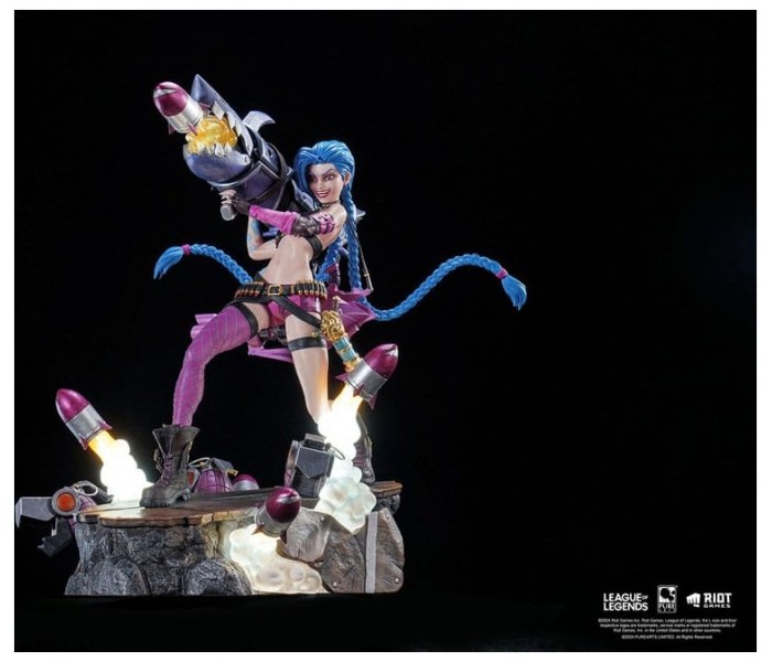 Fabricada en **poliresina de alta calidad**, esta figura de Jinx no solo destaca por su nivel de detalle, sino también por incluir una **función de luz LED** que realza su presencia, aportando un efecto visual impactante en entornos con poca iluminación. El conjunto de medidas proporciona una presencia destacada en cualquier colección.
