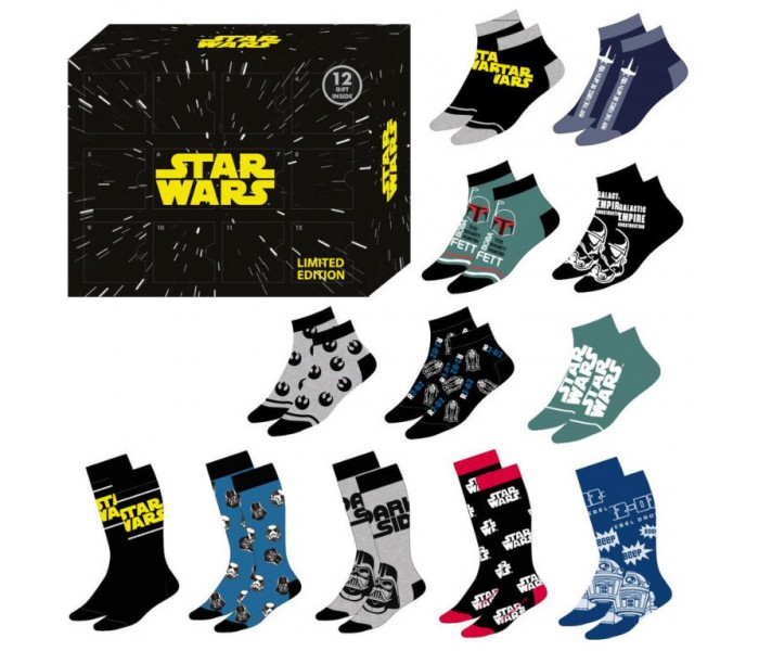 La caja regalo de **12 pares de calcetines Star Wars** es la elección perfecta para los fans de la saga galáctica más famosa. Diseñada como un exclusivo calendario de regalo, esta edición limitada incluye una selección variada de calcetines cortos y largos con motivos de personajes icónicos como Darth Vader, R2-D2, Boba Fett o Stormtroopers. Ideal para sorprender o coleccionar, ofrece una combinación de diseño temático y comodidad diaria, en talla única 40-46.