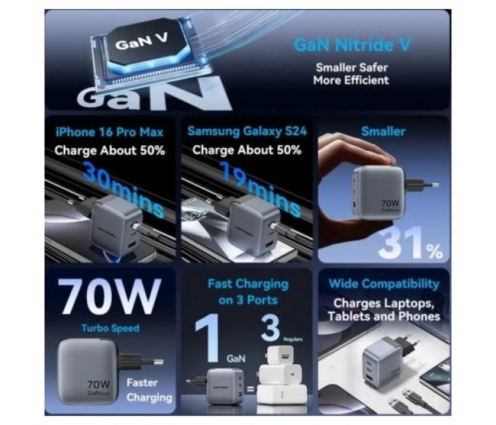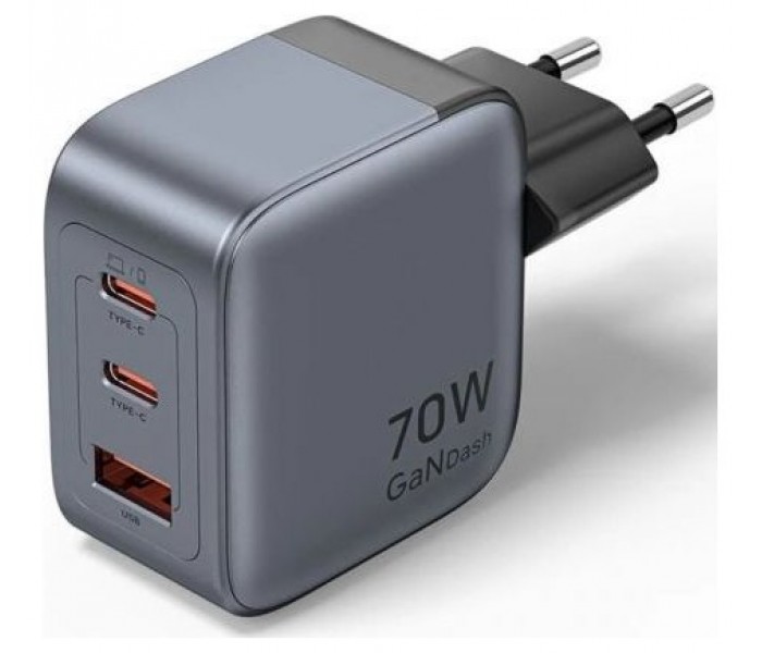 - Nombre: Cargador GaN USB de 3 puertos (C+C+A) (70W/70W/22,5W) enchufe EU gris