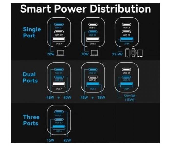 - Salida USB-C1/USB-C2: 5,0V⎓3,0A 15,0W; 9,0V⎓3,0A 27,0W; 12,0V⎓3,0A 36,0W; 15,0V⎓3,0A 45,0W; 20,0V⎓3,5A 70,0W