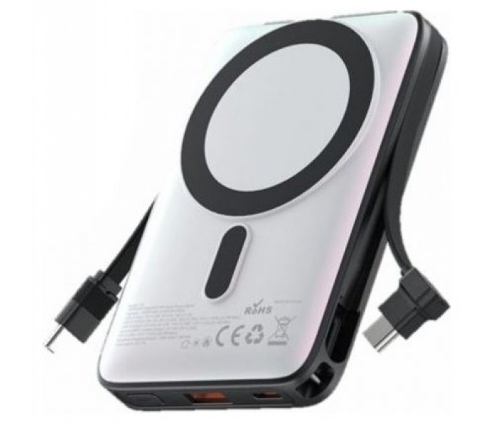Batería externa magnética de 10,000 mAh (USB-C + USB-C/USB-A/Inalámbrico) con cable incorporado y soporte. Potencia de salida: 22.5 W Pantalla LED blanca Material: ABS con recubrimiento UV Soporte de aleación de aluminio