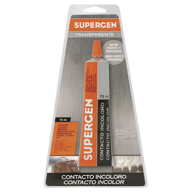 Pegamento Supergen Incoloro 75 ml. - Tubo de 75 ml. - Cola de contacto para uniones resistentes, flexibles, duraderas y transparentes. - Indicada por su transparencia, para unos acabados más limpios en todos los trabajos de bricolaje y reparación. - Adhesivo incoloro y de secado rápido. Con resistencia al envejecimiento y a la radiación ultra violeta. - Formulado con disolventes orgánicos no nocivos. No contiene tolueno. Encolado flexible, mantiene la elasticidad y acompaña las tensiones de cada material. Resiste a temperaturas desde -10ºC a 60ºC.