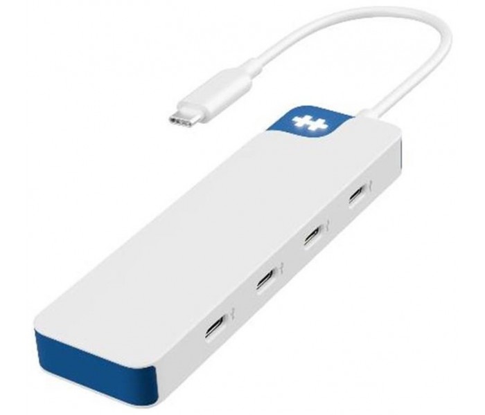 Este hub multipuerto cuenta con **4 salidas USB-C** con una velocidad de transferencia de hasta **5 Gbps**, lo que garantiza una transmisión de datos rápida para dispositivos como discos duros externos, memorias USB o periféricos. Su diseño minimalista en color blanco se adapta perfectamente a cualquier escritorio o configuración de oficina.