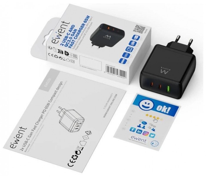 EWENT Cargador Gan Fast 65W 2 USB-C PD-1USB-A QC