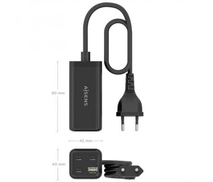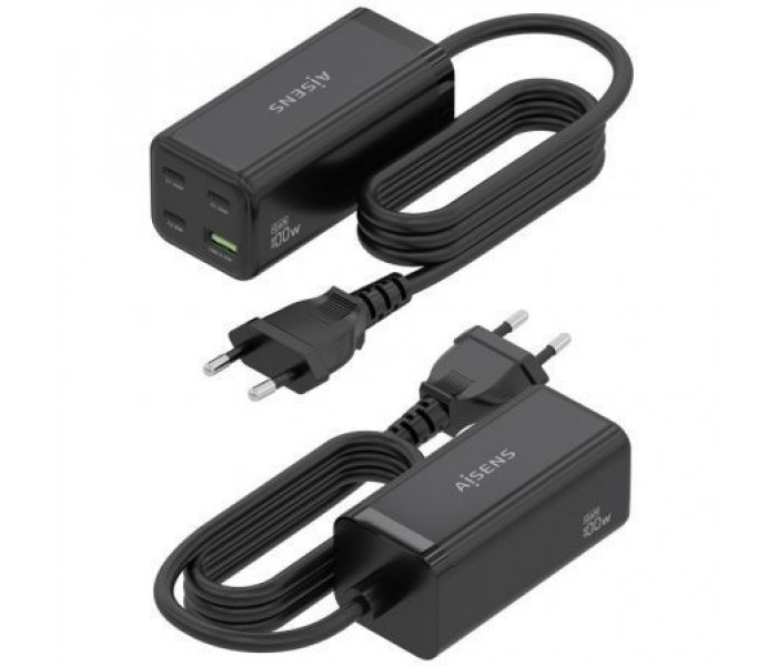 AISENS - CARGADOR SOBREMESA GaN 100W, 3xUSB-C PD3.0 QC4.0 QC5.0, 1xUSB-A QC3.0, NEGRO