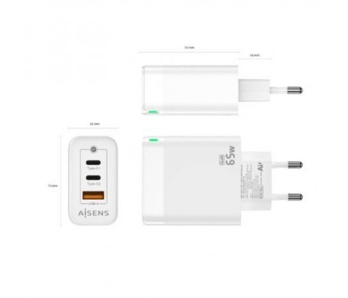Cargador Gan de Pared Aisens ASCH-65W3P007-W/ 2xUSB Tipo-C/ 1x USB/ 65W