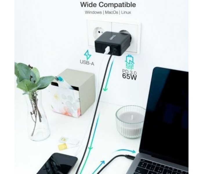 Cargador de Pared Universal Vention FJDB0/ Toma de Corriente Universal/ 2xUSB Tipo-C/ 1xUSB/ 65WSumérgete en la máxima comodidad con un solo cargador. Con salidas de puerto único USB-C1/C2 que alcanzan los 65 W, este cargador admite carga rápida para dispositivos de alta potencia como computadoras portátiles, lo que mejora significativamente..