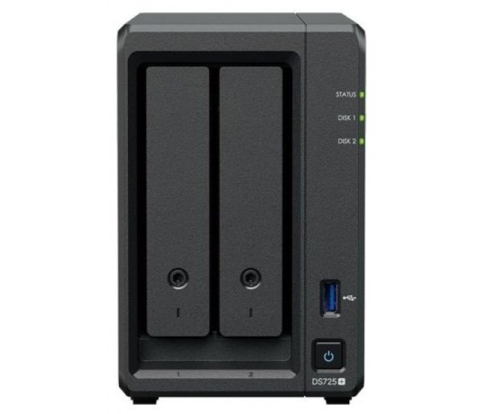 El DS725+ cuenta con conectividad 2.5GbE integrada y admite tanto SSDs SATA como HDDs en bahías internas de 2.5"/3.5", así como unidades M.2 NVMe a través de ranuras M.2 para su uso como caché.
