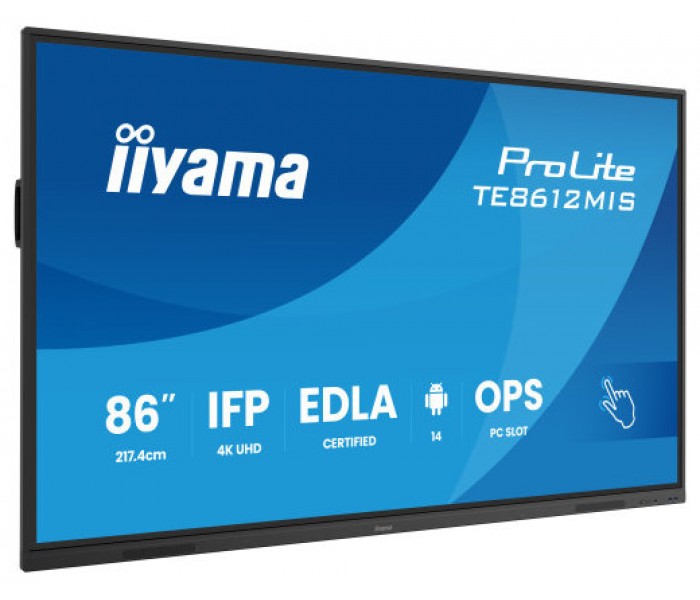 MONITOR INTERACTIVO IIYAMA 86" EDLA, ANDROID 14, 8/128GB, 40-P,3840X2160,UHD,MM 2X 20W,VGA,HDMI 2X /1XOUT, 2X USB-C,MINI-JACK OPTICAL OUT,USB TOUCH, 400CD/M2,LANDSC MODE,MEDIA PLAY USB, AG,LAN,RS232C,IIWARE,WIFI/BT,VESA 800X600,SLOT OPC (TE8612MIS-B4