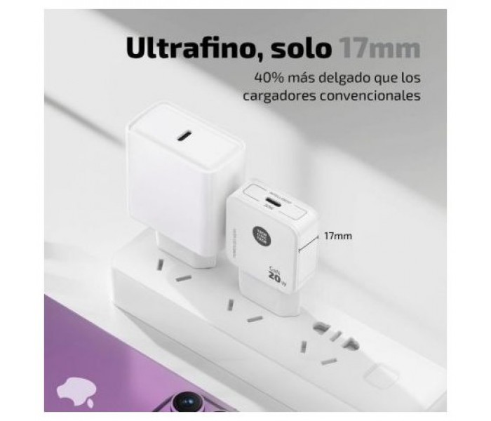 Cargador ultrarrápido GaN Power Delivery 3.0 (PD) 20W, color blanco.